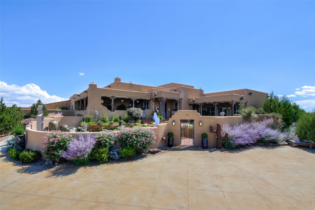 One of the most majestic estates in all of Santa Fe, this exceptional 5-bedroom home with a guest house, office, studio or ideal exercise room, resort-style pool, 5+ car climate-controlled garage with a workshop, is sited high above it all on 8.5 acres with some of the most stunning surround views in Santa Fe. This extraordinary estate excites and captivates with impressive architecture, Polysteel construction, flexible use of living space and rare old world craftmanship throughout. Ideal for entertaining, the main house stuns with a grand open concept living room complete with dramatic reclaimed beam ceilings, access to the expansive outdoor entertainment areas, fireplace, a well-appointed wet bar and a formal dining area. The massive chef's kitchen offers dual islands with surround seating, professional appliances, butler's pantry and wine coolers, all of which opens to a casual living room /media room and pool. The luxurious owner's suite delights with majestic views, 2 enclosed private portals and a spa-like bath with custom dual vanities and a large walk-in closet. Upstairs are 2 spacious guest bedroom ensuites with balconies which overlook the pool and endless mountain views and a sitting room with surround view windows. Guests will enjoy complete independence with the detached 2 bedroom, 2 bath guest house, complete with a kitchen and pool access. The climate-controlled 5+car garages, offer endless possibilities with a ½ bath and separation of space with vast options for wine storage, a workshop or additional living areas. The superior outdoor living experience offers an enclosed refreshing pool, centered between the house and guest house, a pool-side outdoor kitchen, surround enclosed courtyards, elevated covered portals with a cozy outdoor fireplace, vibrant rose gardens and a tranquil front entrance fountain. Less than 15 minutes to the Plaza, and within close proximity to the Club at Las Campanas, this exquisite estate offers the true Santa Fe lifestyle.