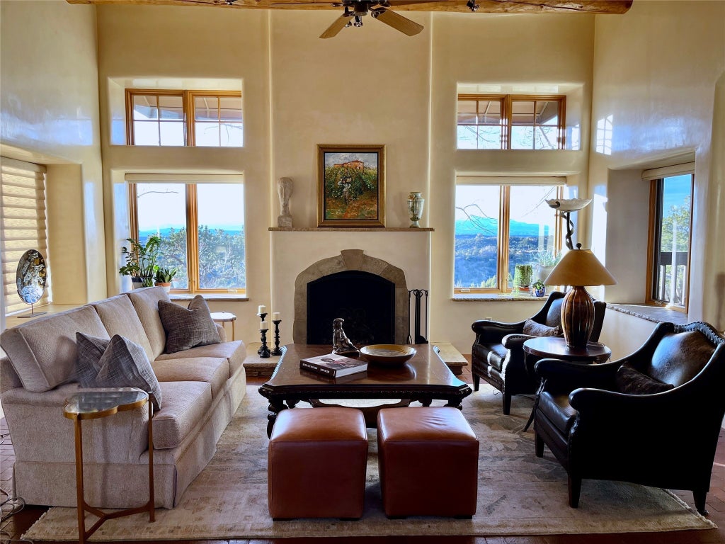 This impeccably updated and maintained home offers the best of Sierra del Norte living. Homes of this quality rarely come on the market, and it is a must see for a discerning buyer who wants architectural excellence, privacy, views, and convenient access to the heart of Santa Fe and the ski area. Upon entering the house, the western views of the Jemez and quality of construction attract your immediate attention. Finishes are top-of-line and include diamond finished plaster walls, vigas with coved ceilings, reclaimed pine, brick and flagstone floors. The inviting floor plan has separate primary and guest wings bordering central living spaces. Each suite features fantastic views, en-suite baths and wood burning fireplaces. The kitchen has been completely remodeled with top notch materials and appliances including a wine cooler and steam convection oven. The kitchen flows well into the living/dining areas and adjacent den for easy entertaining. The south wing primary suite and spa like bath are spacious and private with the closet featuring a dedicated second washer and dryer. The wing also features a private office with its own exterior entry. The home is fully air conditioned and heated with three forced air zones in addition to radiant in-floor heating throughout. Portals are located on each side of the house to take advantage of sunrises and sunsets. The semi-circular driveway has plenty of room for guest parking and is gated at both ends. An oversized two-car garage and has room for a shop or other creative space. The grounds are landscaped with rock walls and mature trees and plantings and are fenced with canine friends in mind. This is a jewel of a home and is not to be missed. Be sure to view the 3D tour.