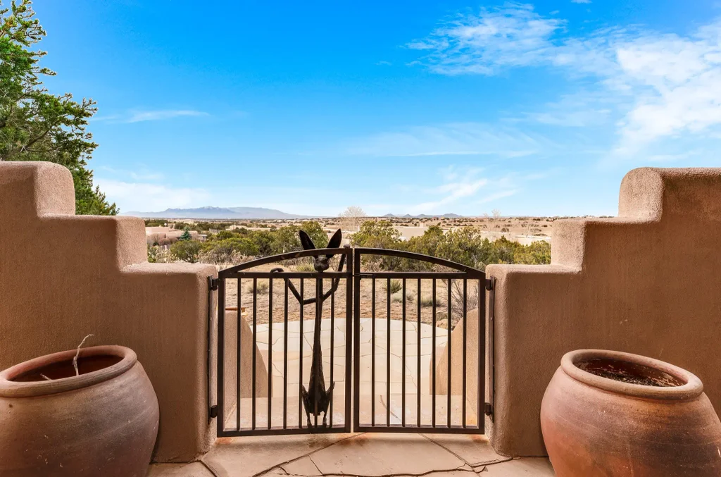 Welcome to the epitome of Santa Fe living. Sited on a hilltop overlooking the Galisteo Basin, this charming single-level home invites you to experience comfort and convenience framed by the breathtaking New Mexico landscape. With a generous 2,456 (+/-) square feet of living space, this 3-bedroom and 2-bath residence features a central living area and wraparound portals - perfect for entertaining. Inside, Southwestern touches abound. High beamed ceilings, kiva fireplaces, nichos, bancos, new LED recessed lighting, and large windows make for a warm and inviting sanctuary. Its well-balanced floor plan boasts a spacious primary suite that includes a large walk-in closet, soaking tub with separate shower, and double vanity, with excellent separation from two additional rooms and a hallway bath opposite the living area. A well-appointed kitchen with separate dining room is ready for hosting gatherings or a quiet evening at home. Other features include a separate laundry room, 3-car attached garage, in-floor radiant heat, and flagstone patios. This well-maintained property presents not just a house, but an opportunity to live on over 2 acres above one of the most enchanting environments New Mexico has to offer.