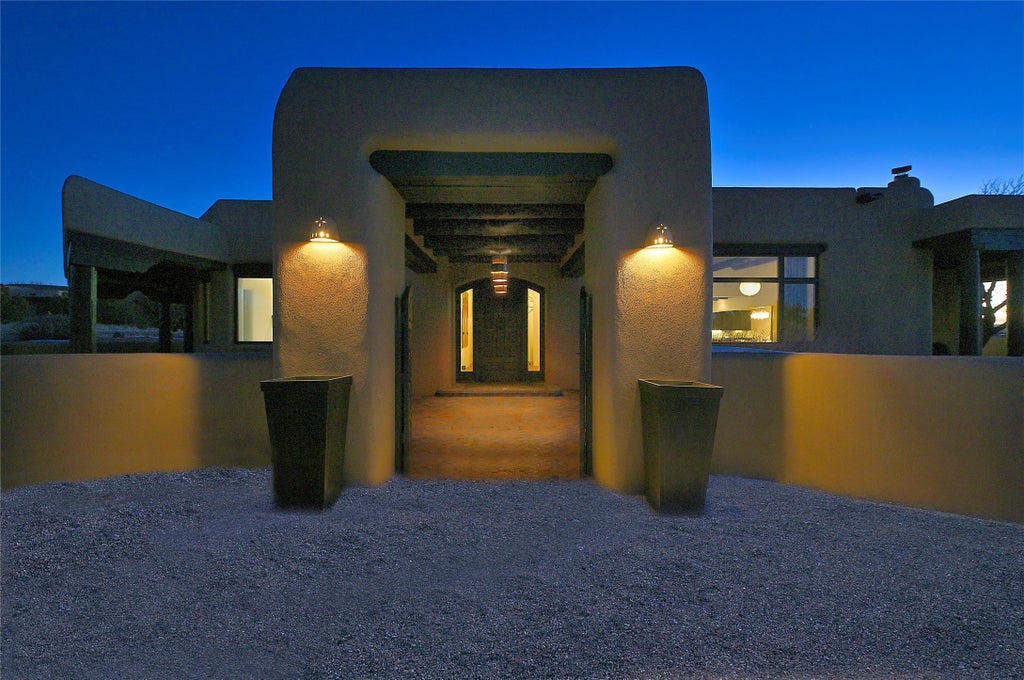 Experience the elegance and grandeur of this Las Campanas home set on 2 pristine acres close to the lake and the 3rd and 4th fairways of the Sunrise Golf Course. This exceptional residence is thoughtfully positioned to showcase expansive and breathtaking views of the Sangre de Cristo and the expansive Jemez Mountains. Built with durable pumice-crete, the home features robust walls that ensure a peaceful and solid environment. Step inside to discover the stunning newly refreshed interior which includes reclaimed Douglas Fir wood flooring that flows throughout the living spaces, enhancing the home’s warm and inviting ambiance. Each bathroom has been completely updated with contemporary tile and Kohler plumbing fixtures, ensuring a fresh and modern aesthetic. Entertaining will be a breeze with the brand new kitchen that features stylish custom cabinets, elegant countertops, a Sub Zero refrigerator, and an impressive 8-burner Viking range. A spacious pantry provides ample storage for kitchen essentials and small appliances. For moments of relaxation or focused work, a separate office/den offers a cozy retreat. Additionally, a versatile bonus space with its own bathroom and beverage bar is perfect for use as a fourth bedroom, private office, or attached casita for guests. With a newer roof and recently refreshed stucco, the exterior has been meticulously maintained, including painted and sealed wood accents. There is also a new water heater and new central refrigerated air conditioning. The interior design, curated by Lisa Samuel, creates a refined atmosphere, with furniture and accessory packages available separately. Las Campanas is a prestigious community offering Golf, security, and 24-hour paramedic services on-site. Memberships to the Club are available, providing access to a lifestyle that epitomizes the best of Santa Fe, featuring stunning views, expansive spaces, and close proximity to world-class shopping, dining, art, and cultural experiences.