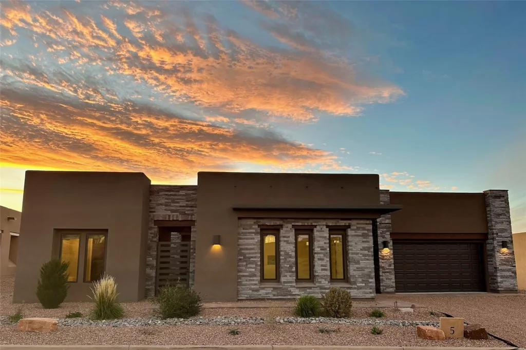 Live the ultimate Las Campanas lifestyle. Sited on a premier, elevated view lot, this exquisite 2023-built house and guest house, walking distance to The Club at Las Campanas, with a 3-car garage and stunning Jemez Mountain views is a rare find and exemplifies the unique blend of modern design with the true essence of Santa Fe. The gated front entrance leads through an intimate courtyard, which connects the main house to the guest house. Thoughtfully designed, this fabulous home offers an expansive living room, ideal for entertaining, with western views, a modern gas fireplace with stacked stone accents, wet bar or ideal barista area, and retractable glass doors which open to the covered portal and expanded exterior entertainment areas with a gas fireplace. Directly off the living room is the ultimate chef's island kitchen with a breakfast bar, Wolf dual fuel 6 burner gas range with double ovens & griddle, plus a 3rd Wolf electric oven and microwave, Subzero refrigerator, and large pantry, all of which opens to the spacious dining room with beautiful mountain and sunset views. Separate from the main living areas is a luxurious primary suite with Jemez Mountain views, sitting area, fireplace, and a spacious spa-like bath with a free-standing tub, walkthrough shower, dual floating vanities, and a large walk-in closet. Additional design features include two guest bedrooms, each with ensuite baths which share a secondary living room or ideal media room, an office directly off the main entrance with courtyard views located off the front entrance, and a private guest house with its own bath. This spectacular home captivates with luxury finishes, smart home technology, expansive views, a tranquil outdoor living experience, enhanced within the fully enclosed courtyards, covered portal with a fireplace, views, and vast entertainment areas. Some furnishings are available for purchase on a separate bill of sale. This special home defines excellence and is move-in ready!