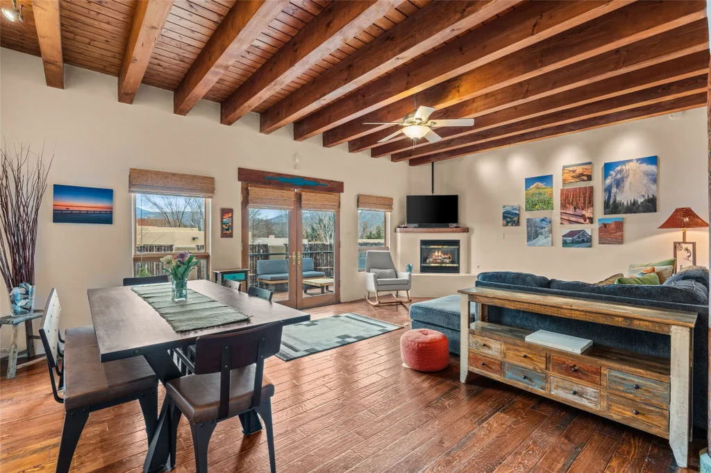 Move-in ready, located in a prime in-town neighborhood, as sited with mountain views: 218 Calle Roble is a gem and an incredible value. This 2,423 square foot, 4-bedroom, 3-bathroom home in the Casa Solana neighborhood is warm, inviting, and in excellent condition. With two levels, the first floor welcomes one into an open-concept kitchen and living area with high-beamed ceilings, wood floors, and a cozy gas fireplace. Off the open entertaining space is a flexible bedroom or office space and a three-quarter bath. Upstairs, hosts a generous primary bedroom with large windows framing the Sangre de Cristo Mountains. One can see the lights of the snow groomers at Ski Santa Fe as they settle down for the night. Two additional guest bedrooms and a shared bath complete the upper level. The outdoor spaces are low maintenance and incredibly functional comprising an elevated balcony, a cozy dining courtyard off the living room, and a fenced in dog run or garden area in the back. The location is unbeatable: just minutes from Santa Fe Plaza; walking distance to the restaurants, cafe, grocery store, yoga center, and brewery at the Solana Center; nearby to the Frank Ortiz dog park and the La Tierra trail system; not to mention access to the Casa Solana community pool. This is true urban living with a Santa Fe flair. With a six year old roof still under warranty (with Santa Fe Stucco and Roofing) and a combi-boiler and stucco that are only three years old, this home asks nothing of the new owner except to move in and enjoy.