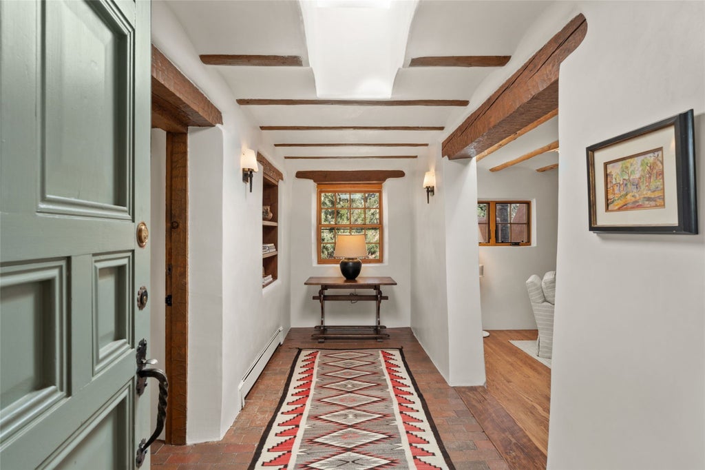 Legacy of Art and Architecture on Camino Del Monte Sol - Gracefully unfolding along iconic Camino Del Monte Sol - just moments from the legendary galleries and cafes of Canyon Road - this extraordinary Historic Eastside compound is a rare fusion of heritage, artistry, and architectural distinction. Once home to the Wheelwrights and graced by Georgia O’Keeffe, who lived in the guesthouse during her early years in Santa Fe, the property is steeped in cultural legacy. The Pueblo Revival 3BR/3BA main house (apx 2,822 sqft), begun in 1920, and the 2BR/2BA guesthouse (apx 1,577 sqft), added in 1925 on .34 acre(s), have been thoughtfully enhanced over time while preserving their timeless character. Signature elements, thick adobe walls, hand-carved vigas, coved plaster ceilings, antique doors, fine finishes and fixtures, and a blend of pine plank and flagstone floors imbue the home with warmth and soul. Eight (8) fireplaces provide lyrical rhythm, while a wisteria-draped abundant garden offers architectural charm and seclusion.