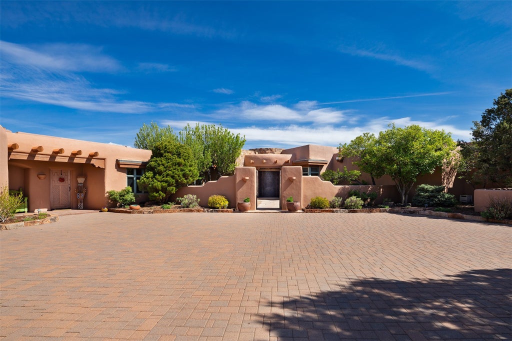 One of the most captivating estates in the famed community Las Campanas and throughout Santa Fe, this exceptional 4-bedroom home, plus office, with a guest house, excites with expansive Jemez and Sangre de Cristo Mountain views and impressive architecture. Privately sited on a rare, 5.25-acre view lot, in resort-like setting, this fabulous adobe-constructed home offers the ultimate Santa Fe lifestyle. Upon entering the 4,430 square foot main house with 2 bedrooms, plus an office, the exceptional experience begins with a welcoming front entrance courtyard, complete with vibrant landscape and a tranquil water feature. Ideal for entertaining, the main house delights with a stunning formal living room and dining room, with majestic Jemez and Sangre Mountain views, fireplace, wet bar and portal access, all of which opens to the well-appointed kitchen with large pantry and spacious casual living room with a fireplace and breakfast dining area. The primary suite impresses with views, fireplace, seating area, outdoor access, a spa-like bath with soft natural light and a large walk-in closet. Additional design features include a grand office with a fireplace and a private guest bedroom ensuite with views and outdoor access. Ideal for guests, the fully independent 1,688 square foot guest house offers 2 bedrooms, 2 baths, a full kitchen, and a great room living area, complete with a washer/dryer and a 1-car garage. The superior outdoor living experience is enhanced with lush, surround landscape, an in-ground spa, an outdoor kitchen, fully enclosed courtyards with gardens and surround covered portals, a fireplace and a substantial roof deck with surround views. Extraordinary finishes include an iconic Hogan front entrance ceiling, creamy plaster walls, flagstone flooring and the highest level of timeless craftsmanship. Less than 15 minutes to the Plaza, and within close proximity to the Club at Las Campanas, this exquisite estate is move-in ready and not to be missed.