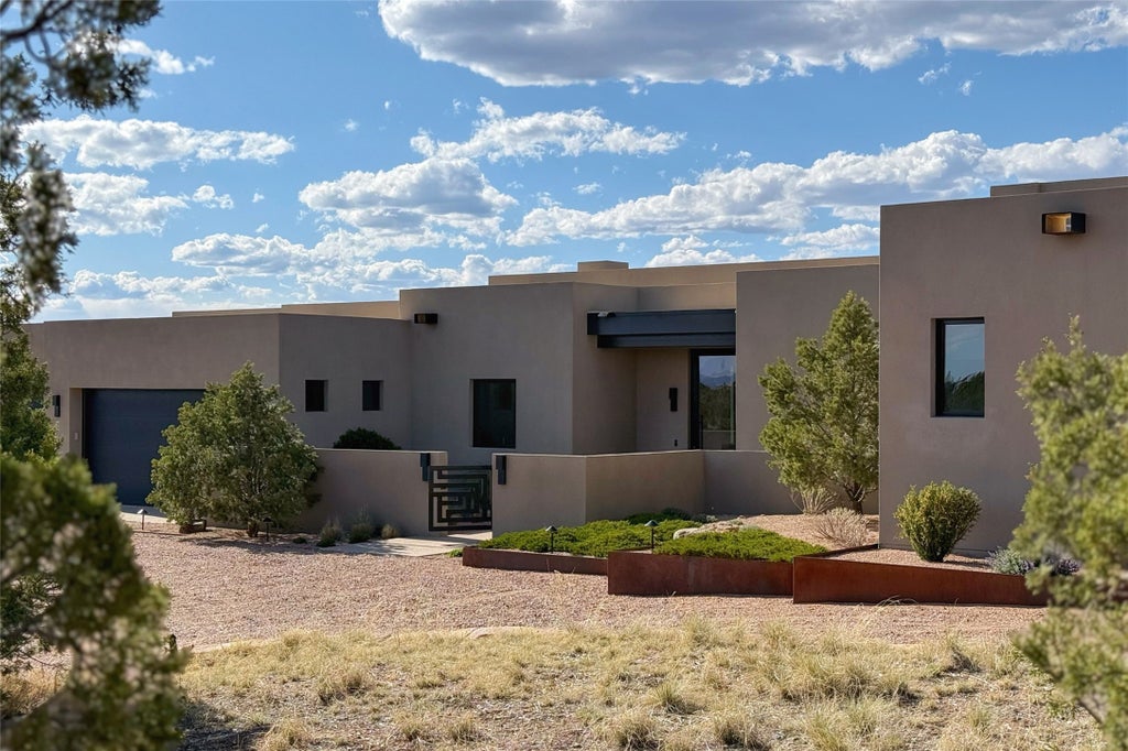 Stunning Contemporary Estate with Panoramic Big Sky Views. Welcome to 9 Plaza del Centro, an exquisite contemporary hilltop home designed for seamless indoor-outdoor living. This custom built Zachary & Sons home is a 5X 2021 Parade of Homes winner. Enter through a large glass pivot door into a breathtaking space with panoramic views, and floor-to-ceiling windows. An impressive tiled fireplace matches the size of the windows, and anchors the living space, creating a sleek yet warm and inviting atmosphere. The outdoor portal area is ideal for entertaining, featuring a built-in gas grill, hammered steel gas fire pit, and plenty of space to enjoy the stunning natural surroundings. Throughout the home, Hunter Douglas custom all-electric shades provide convenience and comfort at the touch of a button. While wall-washer sunlights in the hall and 3 large sunlight in the kitchen provide beautiful ambiance. The chef’s kitchen is a dream, showcasing custom Ernest Thompson rift white oak cabinets, Wolf cooktop, oven, and steam oven, and Subzero appliances, including a wine fridge. A spacious Mont Blanc Quartzite island and countertops complete this luxurious kitchen. Large, accessible cabinetry adds functionality without compromising design. This 3-bedroom masterpiece features a luxurious primary suite complete with a private portal boasting mountain views, another exquisite tiled gas fireplace and built in custom cabinetry. The master bath features floating vanities and opal white marble countertops. An additional 1 bedroom, 700 sq ft casita offers an independent retreat with its private portal and Sangre de Cristo mountain views. Pocket doors lead to the bedroom, and black mist granite bathroom countertops maintain the luxury of the main house. Don’t miss this rare opportunity to own a private oasis blending modern luxury and breathtaking vistas.