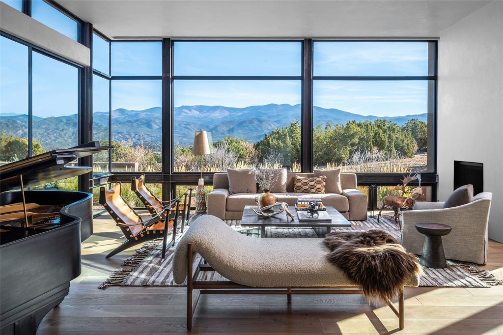 Experience the pinnacle of luxury living in this stunning 4-bedroom, 3.5-bath home, including an 878 sq. ft. guesthouse. Situated within the esteemed Monte Sereno community, this award-winning residence, designed by architect Robert Zachry and builder Scott Wong of Solterra, captures the essence of modern elegance. Perched on one of the highest lots in the community, with a private, gated entrance, enjoy 270-degree unobstructed views of the Sangre de Cristo Mountains, the Badlands, Ortiz/Sandia Mountains, and the twinkling lights of Santa Fe. This single-level home has recently been thoughtfully reimagined by designer Mary Clark with luxury finishes throughout. The flow from the living room to the dining area, kitchen, and outdoor portals creates an inviting atmosphere. The open kitchen includes custom oak cabinetry, travertine countertops, Gaggenau ovens, Thermador and Miele appliances, as well as a hidden scullery. Luxurious owner’s suite provides privacy, featuring a Swedish wood burning stove, two walk-in closets, exercise room, and an en-suite bath with a travertine wet room, Waterworks soaking tub, Vola faucets and shower for two. Additional highlights include 32 solar panels, a heated driveway and sidewalks and a comprehensive audio system. The in-ground hot tub / plunge pool and outdoor custom kitchen, equipped with a Hestan grill and Alfa gas pizza oven, are ideal for entertaining. Low-water xeriscape landscaping enhances outdoor appeal, while the 2-car garage plus another in the guesthouse adds convenience. Discover unparalleled living in a convenient, close-in location where comfort and sophistication unite.