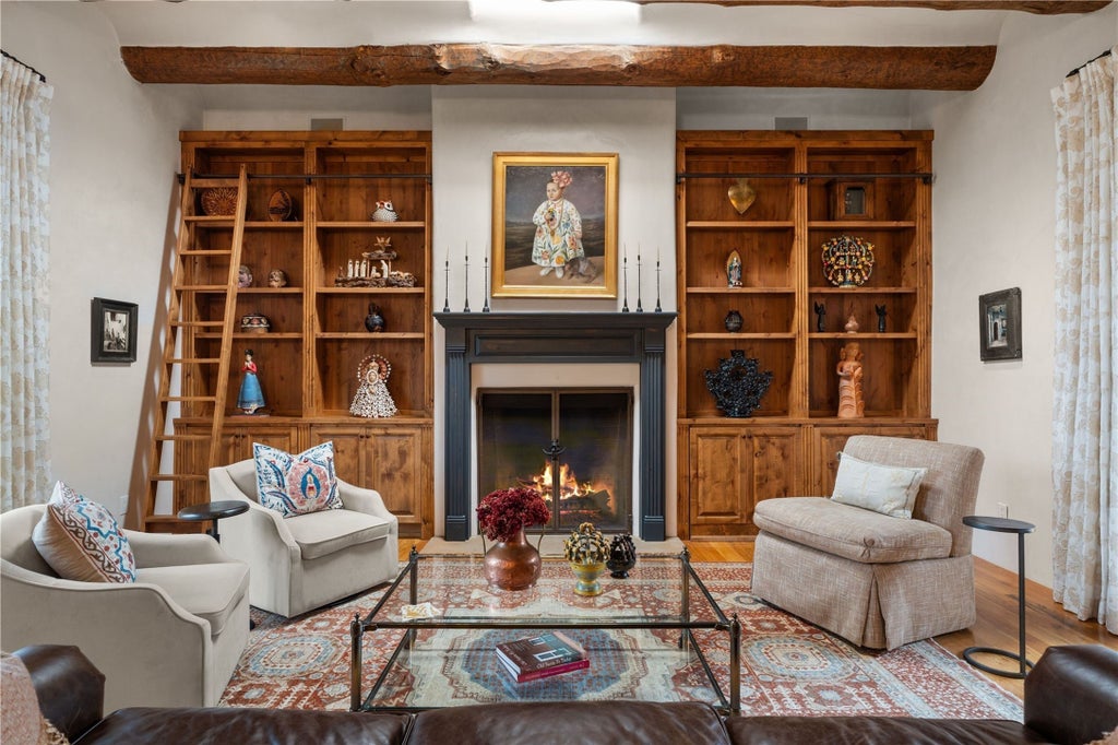 A rare opportunity in the heart of Santa Fe’s Historic Eastside, this adobe home and casita— within the six-unit San Antonio Compound built by renowned builder Jay Parks—offers timeless craftsmanship and thoughtful design in the form of a mini compound. Situated on the wide and peaceful San Antonio Street off of Acequia Madre, the offering comprises two separately deeded condominiums sharing a common courtyard, which provides the owner with a three-bedroom main house and an impeccably charming one-bedroom casita. The main house features white oak flooring, antique wooden beams and doors, custom plastered walls, and five fireplaces, typifying the warmth of classic Santa Fe architecture. A stately living room flows into a kitchen with a copper island and granite countertops. There are two bedroom suites plus a third room (served by a hall bathroom) that either works as another guest bedroom or perfect office. Aspen-lined stone pathways within a walled courtyard connect the home to the guest house, passing by a private hot tub that sits between the two homes. The casita is appointed with brick flooring, wood burning fireplace, a freshly updated kitchen, a decadent bedroom suite and two off-street parking spaces – all ensuring your guests will never want to leave. A two-car garage and additional parking are a rare asset in this sought-after downtown location. Meticulously maintained and thoughtfully designed, this is an exceptional offering just moments from Santa Fe’s best dining, galleries on Canyon Road, and the Plaza.