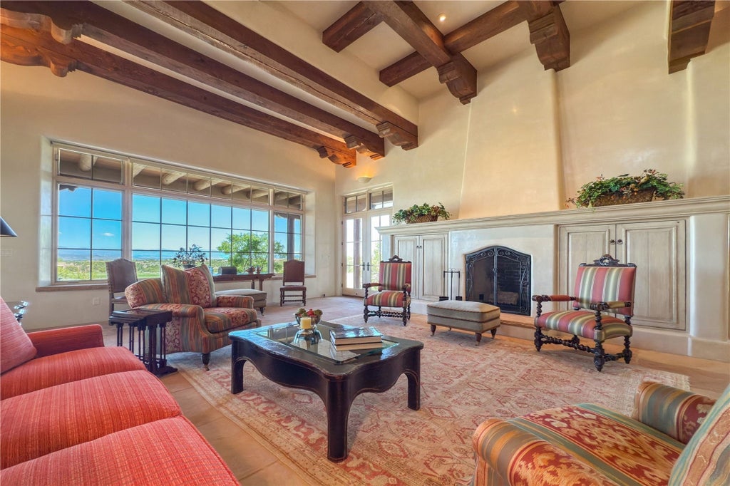 Sophisticated Country Estate with Panoramic Mountain Views in Prestigious Las Campanas. Discover unparalleled luxury in this meticulously crafted estate that seamlessly blends timeless elegance with regional architectural charm. Set within a private courtyard sanctuary surrounded by mature trees, this exceptional home offers breathtaking Jemez and Sangre de Cristo mountain vistas alongside Las Campanas golf course views. Enter through impressive carved alder double doors into soaring ceilings and rich woodwork throughout. The light-filled living room centers around a magnificent fireplace, perfectly framing mountain and golf course panoramas. Hickory wood floors add warmth while shuttered windows enhance the sophisticated country aesthetic. The chef's dream kitchen features a substantial island, granite countertops, and premium appliances ideal for culinary enthusiasts. The curved dining room showcases custom limestone floors, with stunning dual mountain range views leading to a tranquil portal with fireplace—perfect for morning coffee or evening cocktails. Retreat to the spacious primary suite featuring a private portal, mountain vistas, dual walk-in closets, and separate his-and-hers bathroom spaces. All four bathrooms in this home showcase custom decorative tile designed exclusively for this home by renowned Taos artist Jill Rounds. Additional Amenities include a dedicated study offering peaceful views, built-in shelving, and custom alder desk. Two generous guest en-suites share a convenient wet bar and courtyard access. Practical features include a spacious laundry room, kitchen office nook, and mudroom with ample storage. Multiple portal access points maximize indoor-outdoor living. Las Campanas provides 24-hour security and EMT services. Club memberships available for purchase upon approval.