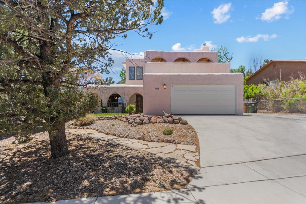 Charming Two-Story Corner Lot Home in North Mesa! Nestled behind a lush wall of mature trees and bushes, this home offers privacy, character, and a peaceful setting. Step inside through the brick-accented entry to discover warm vigas-beamed ceilings that carry throughout the main living spaces, adding rustic elegance. A cozy carpeted living room with a large front-facing window floods the space with natural light. Flowing seamlessly from the living room is the open great room, which combines the dining area and spacious family room anchored by a gas kiva fireplace and a tiled sunroom, offering a tranquil space to enjoy year-round. Adjacent to the great room is a white galley-style kitchen featuring quartz counters, stainless steel appliances, and a beautiful chandelier that highlights the ceiling beams. A convenient pass-through counter doubles as bar seating and opens to the family room, making it perfect for entertaining or casual meals. Down the hallway are two guest bedrooms and a guest bathroom. A spacious primary en-suite offers multiple closets and a bathroom with a walk-in shower. Also on this level is a laundry closet, as well as access to a two-car garage. Upstairs, the home continues to impress with a secondary family room featuring rich oak wood floors, a cozy wood-burning stove, and a wet bar—ideal for relaxing or hosting. A second tiled sunroom provides additional light-filled living space, while sliding doors open to a partially covered deck with ample room for lounge seating, outdoor dining, and entertaining. This upper level also includes an additional guest bedroom and a guest bathroom, offering flexible space for guests or hobbies. Throughout the home, you'll find double-pane windows with built-in blinds for energy efficiency and clean aesthetics. The backyard offers a private oasis with a grassy lawn with mature fruit trees. Also, take note of the large concrete driveway with RV parking and 30A RV power hookup.