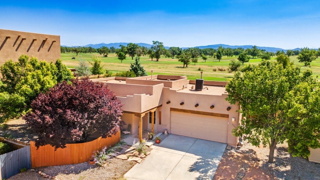 Beauty and peace abound in this light-filled home. Enjoy drinking coffee from the beautifully landscaped backyard adjacent to the cool, grassy, Santa Fe Country Club, where beautiful sunsets and sunrises are sure to delight. This home is sweetly positioned and tucked back off the road and nestled into a delightful backdrop. It’s private and the home has an airy quality to it with its tall viga ceiling. The kitchen is spacious and has an eat in kitchen area. The oversized living room has a large window that looks out to the golf course and a lovely, gas fireplace. The main bedroom is gorgeous and spacious; the main bath has a stunning window over the soaking tub. Also you can enjoy soaking under the stars in the hot tub, which conveys. The home has ample storage, a 2 -car garage, a large laundry with pantry. The kitchen appliances are newer and there is a newer water heater. Conveniently located to the I-25 and 599 and there is no HOA! Visit this link to see interactive floor plan: https://visithome.ai/nJyyRSYqzomNteFuAd7J7r?mu=ft
