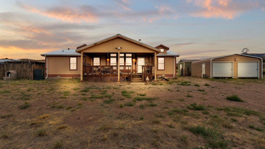 This well-maintained 1,473 sq ft manufactured home sits on a spacious 1-acre lot just minutes from Abiquiú Lake and the Chama River. Located near the Georgia O’Keeffe Museum and local galleries, this property offers a serene setting perfect for artists, nature enthusiasts, or anyone seeking a peaceful retreat. The home is on a permanent foundation and has been fully updated with a new roof, new mini-splits, new water heater, and refreshed interior finishes. The floor plan includes three bedrooms and two bathrooms, providing comfortable living space. Outdoor amenities include a detached two-car metal garage, a separate studio ideal for creative work or guest space, multiple storage sheds, and fenced areas for pets or gardening. The property provides easy access off CR 155 and expansive views of the surrounding landscape. Fantastic location for locals and commuters!