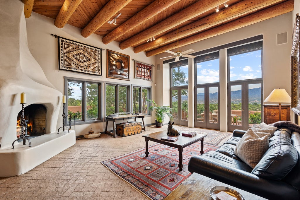 Every so often, a rare opportunity arises in the coveted Casas de San Juan community, and this residence is exactly that. Blending timeless Santa Fe charm with refined elegance, the home offers a perfect balance of warmth, privacy, and sophistication in an exceptional setting. The main house features two generously sized, well-separated bedrooms, each designed for comfort and seclusion. The primary suite serves as a tranquil retreat with its own kiva fireplace and sweeping views of the Sangre de Cristo Mountains. The living and dining room, with soaring ceilings, classic vigas, and a custom kiva fireplace, creates a dramatic yet inviting space for gatherings. A wet bar enhances the ease of entertaining, while French doors open to a landscaped brick courtyard anchored by a heated swimming pool with the amazing Sangre views. A covered portal with an outdoor kiva gracefully connects the main house to the guest casita. With its kitchenette, fireplace, and private entry, the casita offers an ideal haven for visitors. An two-car garage provides everyday convenience without compromising the home’s elegance. Authentic Southwestern craftsmanship is present throughout, from vigas and brick floors to plastered walls, while modern comforts ensure effortless living. Located just minutes from Santa Fe’s world-class dining, art, and cultural offerings, this Casas de San Juan treasure offers the best of both worlds: the lock-and-leave convenience of a managed community and the serenity of year-round living. HOA services include community well and septic, security, road care, and common-area maintenance.