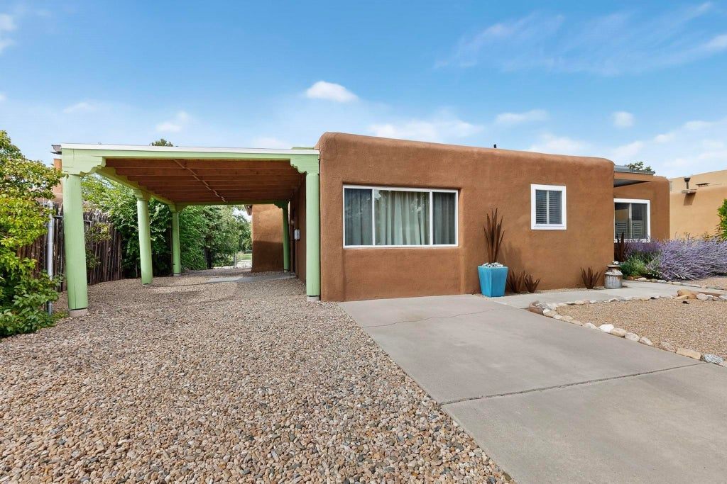 This is the most delightful light and bright midtown home in Santa Fe at a fabulous price! It has brand new stucco, including the shed, and a newly built carport. It has three bedrooms one of which can be used as a study. Conveniently located for the Santa Fe lifestyle and you'll find several parks nearby. The bathrooms have been remodeled and it has a brand new water heater and washer. There's an easy back entrance for RV storage which backs to a park with tennis courts. You'll love this quiet, cheery neighborhood. Come see your new home today!