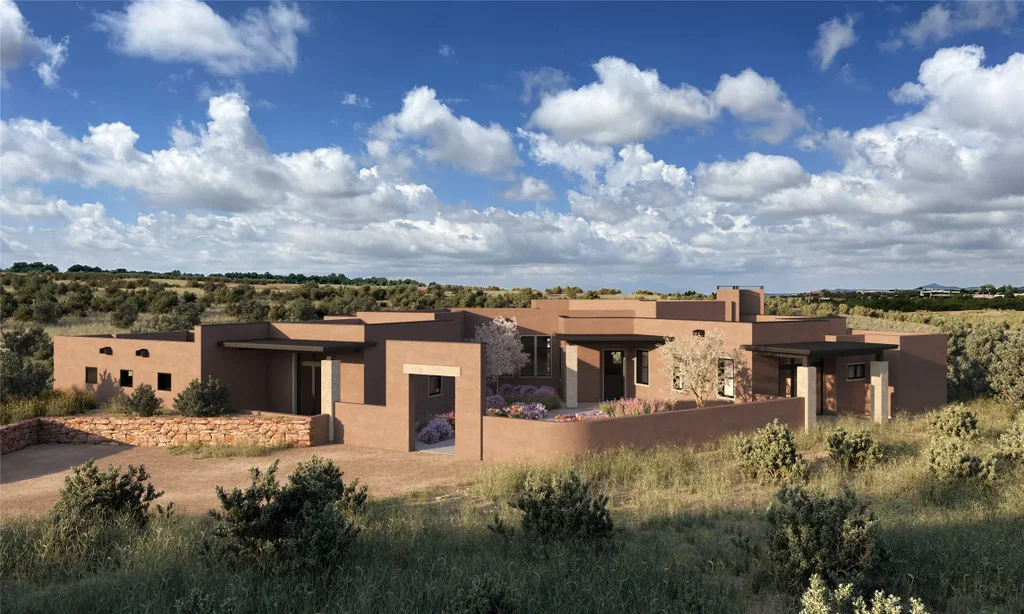 To be built: Nestled on a hidden cul-de-sac in the Estates VII area of the exclusive Las Campanas Subdivision, Rancho de Vistoso sites on a tree-lined elevated bench granting fantastic views of the Sangre de Christo and Sandia Mountains. The 3,248sf home, designed for entertaining on on Santa Fe’s high plain, opens onto 1,452sf of covered portal space increasing it’s generous living area dramatically thru large, tall, glazed openings. The 4 large bedroom suites feature private portals, walk-in closet/richly detailed bath areas and views alternating between large open vistas and private, tree flanked seclusion. The attached guest suite includes a private access thru the 1,600sf, fully-landscaped entry courtyard. Travertine and Cantera stone tile and slab detailing, custom doors and cabinetry, an expanded appliance package and large kitchen with wet-bar and butler’s pantry highlight the dynamic floor plan with it’s sunrise to sunset views. With this home, celebrated Santa Fe designer, Scott Irving, teams with award winning Interior Designer Jann Levinsky to use his signature style, merging pueblo and contemporary architectural detailing to create a radiant contemporary home celebrating the rancho’s of New Mexico’s past.