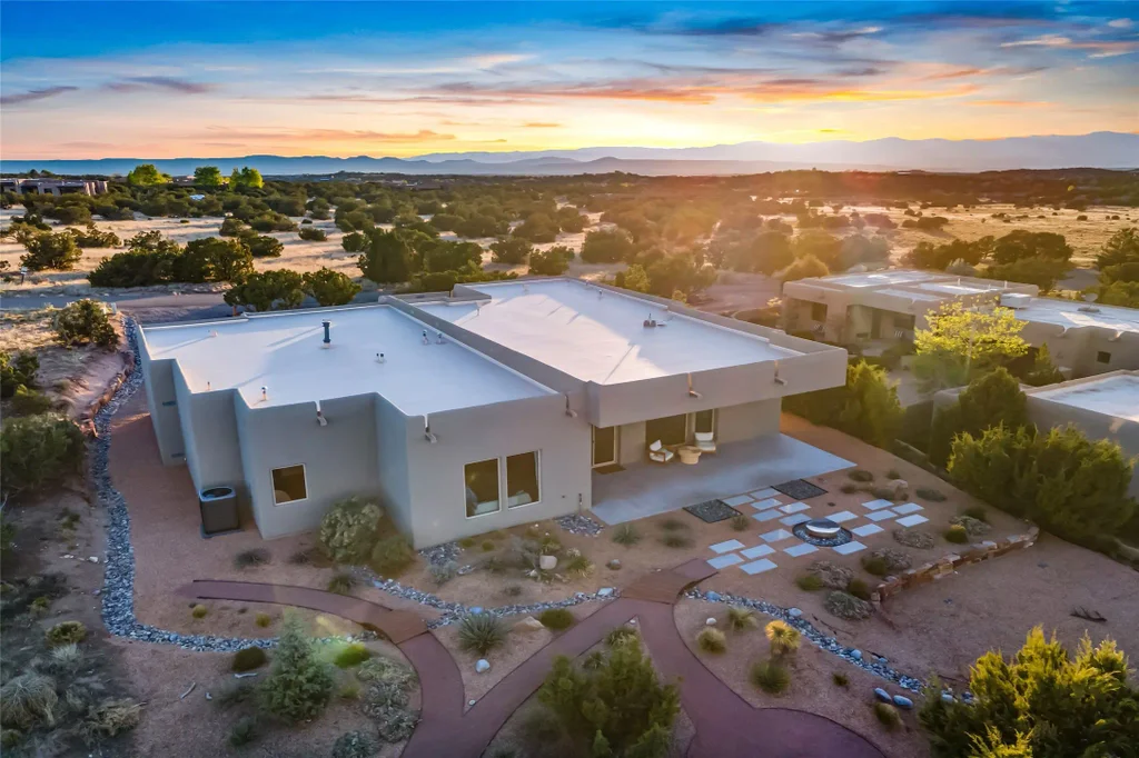 Welcome to 14 Plano Arbolito—where sleek contemporary design meets the serene beauty of Santa Fe’s natural landscape. Perched on a half acre in the desirable Tano West neighborhood, this recently built, single-level home offers the perfect balance of luxury, comfort, and breathtaking views. This three-bedroom, three-bathroom residence boasts an open-concept floorplan designed for effortless living and entertaining. The expansive great room features soaring ceilings, a modern electric ambiance fireplace, and floor-to-ceiling windows that frame spectacular views of the Sangre de Cristo Mountains. The adjacent chef’s kitchen is equipped with premium stainless-steel appliances, a generous island with counter seating, a walk-in pantry, and elegant finishes that blend form and function. Retreat to a tranquil owner’s suite complete with outdoor access, a spa-like bathroom with a soaking tub, dual vanities, a spacious shower, and two oversized walk-in closets—one currently used as an office or yoga space. A separate guest wing includes two private bedrooms, one with its own entrance and en suite bath, perfect for visitors or extended stays. Step outside to a deep-covered portal with gas fireplace hookups and a custom fountain, ideal for enjoying Santa Fe’s vivid sunsets and star-filled nights. The fully landscaped, xeriscape backyard opens to panoramic vistas and unmatched privacy. Additional highlights include an oversized three-car garage, a flexible bonus room off the entry, and many thoughtful upgrades—from whole-house air purification to premium lighting and smart home features. Only 20 minutes from the Plaza and nestled within a community known for its protected open space, 14 Plano Arbolito offers peace, luxury, and a front-row seat to Santa Fe’s majestic beauty.