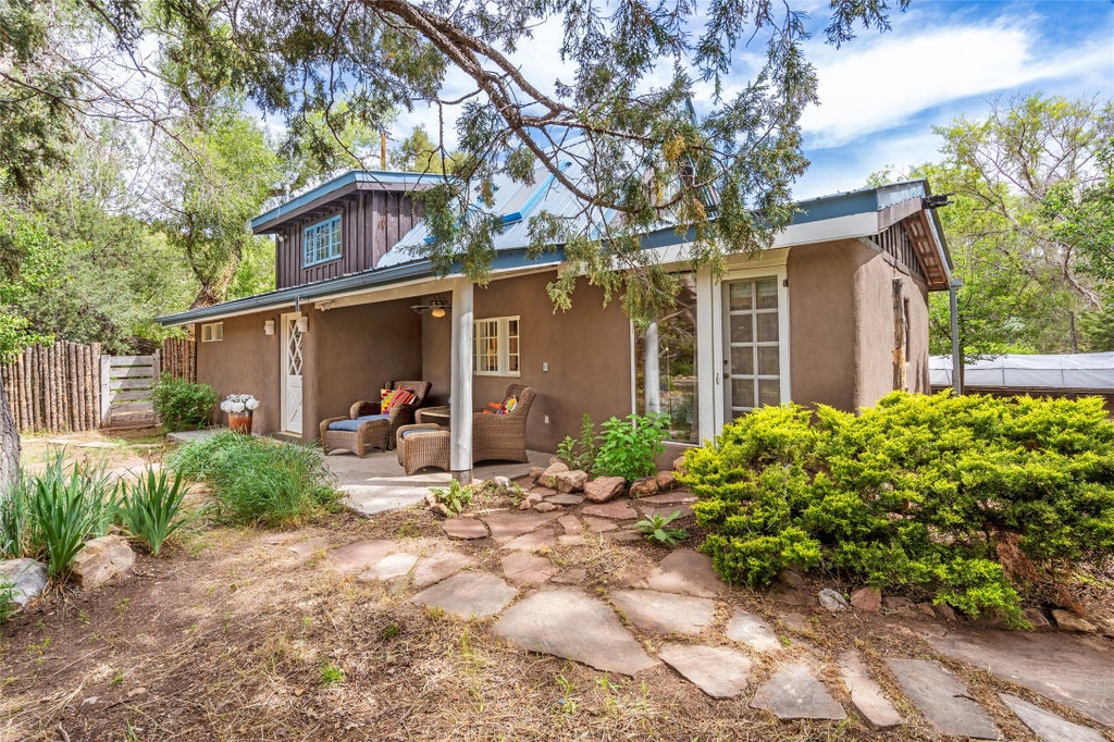 Nature-lover's paradise on 6 Acres- Tucked beneath red rock hills--Cross the bridge from Sibley Road and enter your private sanctuary nestled on six acres of lush, mature land in the serene community of Cañoncito. This one-of-a-kind property features a thoughtfully updated three-bedroom, two-bathroom adobe and frame main house that blends timeless charm with modern luxury. Highlights include fully renovated luxury bathrooms and a gourmet kitchen with artisan tile, locally crafted ironwork throughout, and new sustainable wood floors. The home showcases diamond finish plaster and low-VOC finishes, ensuring both beauty and environmental consciousness.