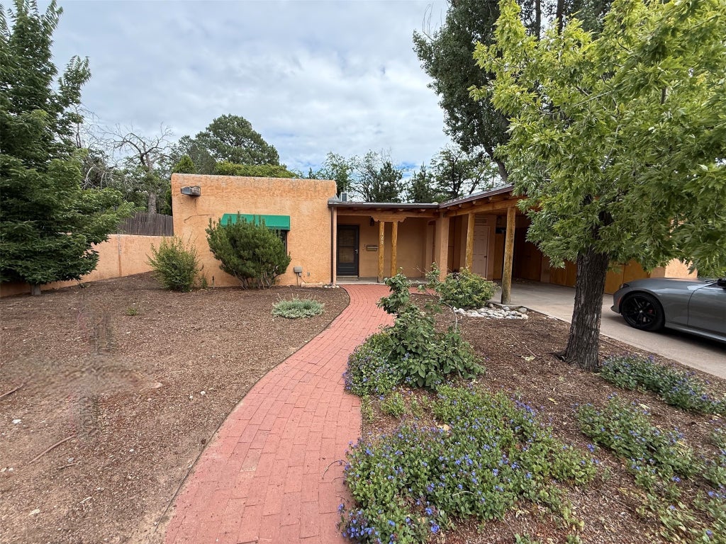 This is one the last of the best. Vigas, wood floors, open living area, with french doors leading out to a fabulous outdoor garden area. Charming living space, gated community, safe and private and only minutes from the Plaza.