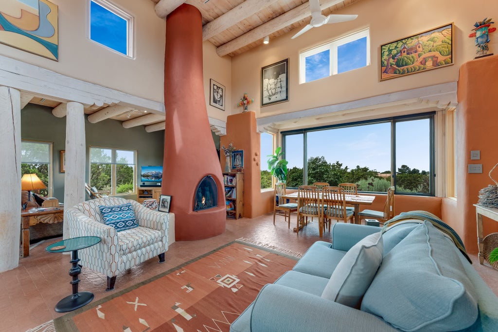 Set on a spacious 1.54+/- acres within the peaceful Eldorado community, this beautifully updated single-story home offers 2800+/- square feet of comfortable living. With 3 bedrooms and 3 & 1/2 bathrooms, it features a versatile layout that includes an attached studio with loft (additional heated 600+/- sqft)— perfect for creative pursuits or office, gym, or meditation space. Recent updates include new paint, new countertops, and modern appliances throughout the kitchen, which also boasts granite countertops, a gas cooktop and wall-mounted double ovens. High ceilings with traditional vigas, brick flooring, and a charming Kiva fireplace enhance the warm southwestern character of the interior. The expansive primary bedroom includes a generous walk-in closet and an updated en-suite bathroom, offering a private retreat. Enjoy uninterrupted vistas from the rear portal or stay cool inside where the views are just as enticing from behind newer Pella windows and mini-splits to keep you cool. There is convenient parking in the 2-car garage and the lot provides flexibility for gardening or recreation. Enjoy the expansive Eldorado Community Amenities including a pool and walking trails. Come tour this estate today!