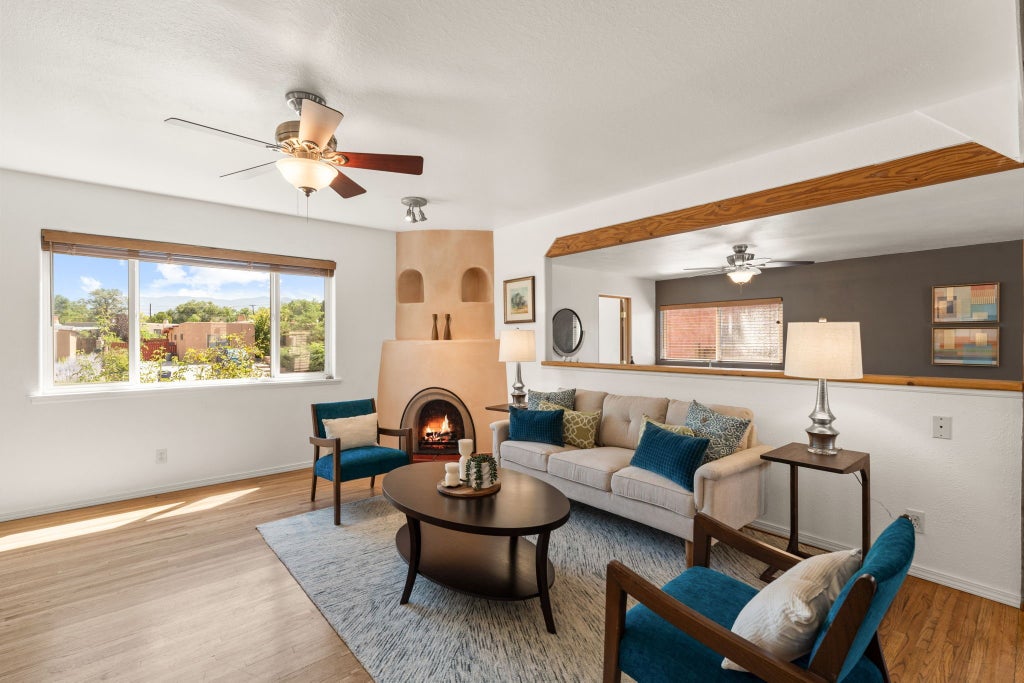 This light-filled and beautifully remodeled Stamm home offers captivating Sangre de Cristo mountain views and a seamless blend of classic charm and modern upgrades. The open floor plan centers around a spacious, completely updated kitchen featuring sleek cabinetry, stainless-steel appliances, and a generous butcher block island with ample storage—perfect for gathering and entertaining, with hardwood floors lending warmth throughout. The inviting living room boasts a cozy corner Kiva fireplace and a large picture window framing the unforgettable mountain vistas. The home offers three comfortable bedrooms, including a primary suite with a tastefully remodeled en suite bath. Central heating and A/C provide year-round comfort. Outside, the expansive and private back yard includes a large storage shed with shelving and a second smaller shed ideal for garden tools. With only one step throughout the entire home, accessibility is easy and effortless. Just moments from the Santa Fe River Trail, La Tierra trails and dog park, and within walking distance to local coffee shops and shopping, this property blends convenience, comfort, and natural beauty into a truly special place to call home.