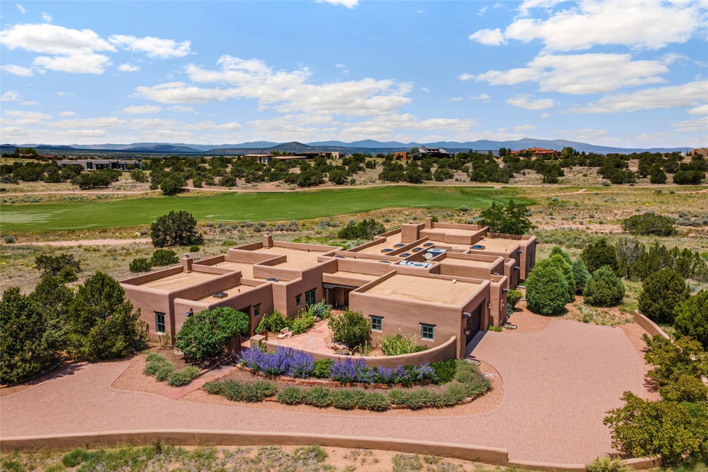This home is the epitome of Refined Santa Fe Elegance, with 4 Bedrooms, 4.5 baths, 4 Fireplaces, No Steps and panoramic views of Sandia Mountain & the Fourth Fairway of the Sunset Golf Course, at the end of a cul-de-sac in Gated Las Campanas. An expansive hallway for artwork features 2 sets of French doors that open to the wrap-around portal for dining & relaxing which extends to the Living Room, also showcases the golf course view. The Gourmet Kitchen includes Viking appliances, an over-size island with prep sink, menu-planning desk & Butler’s Pantry with wine cooler. The Main Bedroom suite offers a luxurious Spa Bath with large shower & whirlpool tub plus a walk-in closet worthy of a designer retail store. Bedroom Two is sequestered from the Main and has an en-suite bath. Bedroom Three with en-suite bath is adjacent to the Main and currently used as an office. Bedroom Four offers total privacy, as an attached Casita with en-suite bath & mini-kitchenette. The expansive brick Portal off the gallery hall includes a built-in BBQ & impressive fireplace, providing the perfect venue for entertaining, dining, relaxing or savoring the panoramic golf course & Sandia Mountain views. The Two-car Garage has eliminated garage clutter, with 29 feet of handsome cabinets plus a power wall to store bicycles, skis & other outdoor equipment. Come see why this 4-Bedroom home with Golf & Mountain views is the perfect embodiment of elegant Santa Fe resort living.