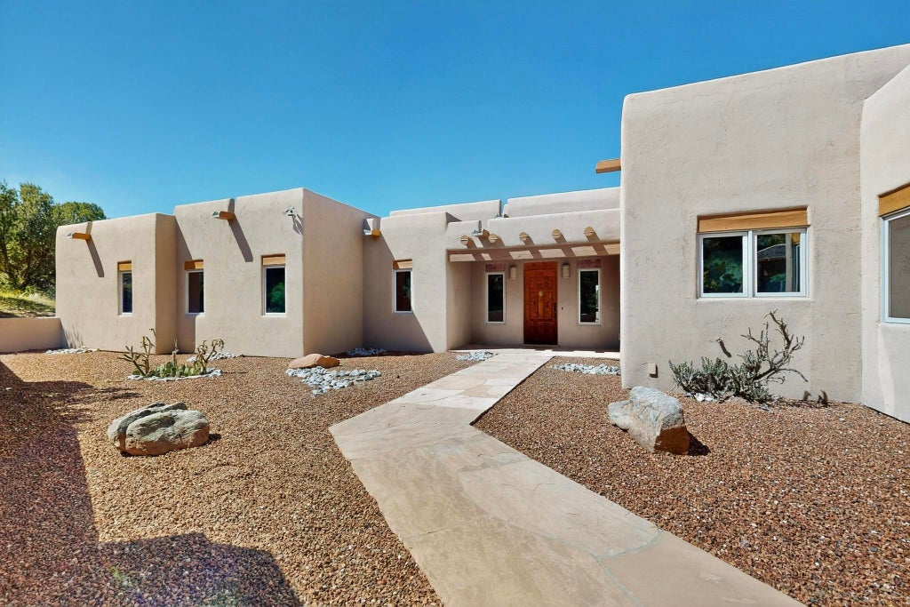 A rare offering in coveted Belicia Estates, custom designed and built this grand Santa Fe pueblo home delights the eye. From gleaming Saltillo tile floors to high viga ceilings, featuring lighted nichos, corbelled beams, 3 traditional kiva fireplaces, a pizza kiva in the kitchen plus an outside kiva for entertainment on the portal. Open plan, split bedroom floorpan creates a separate owners suite with 2 separate bathrooms, a large walk in closet and a separate study/office. There is a grand living room plus family/play room plus formal dining off the kitchen leading out to a wonderfully private walled outside entertainment area with foothill mountain views from the portal. There is a fun chefs kitchen with sunny breakfast nook and large island. There is a separate 2 bedroom and bath guest suite, and convenient laundry room which leads to the spacious 2 car garage. Positioned at the end of a paved cul de sac on 4.3acres close to the gated entry it is within easy reach to 2 local shopping centers, the Galisteo preserve and only minutes into historic Santa Fe. A must see:)