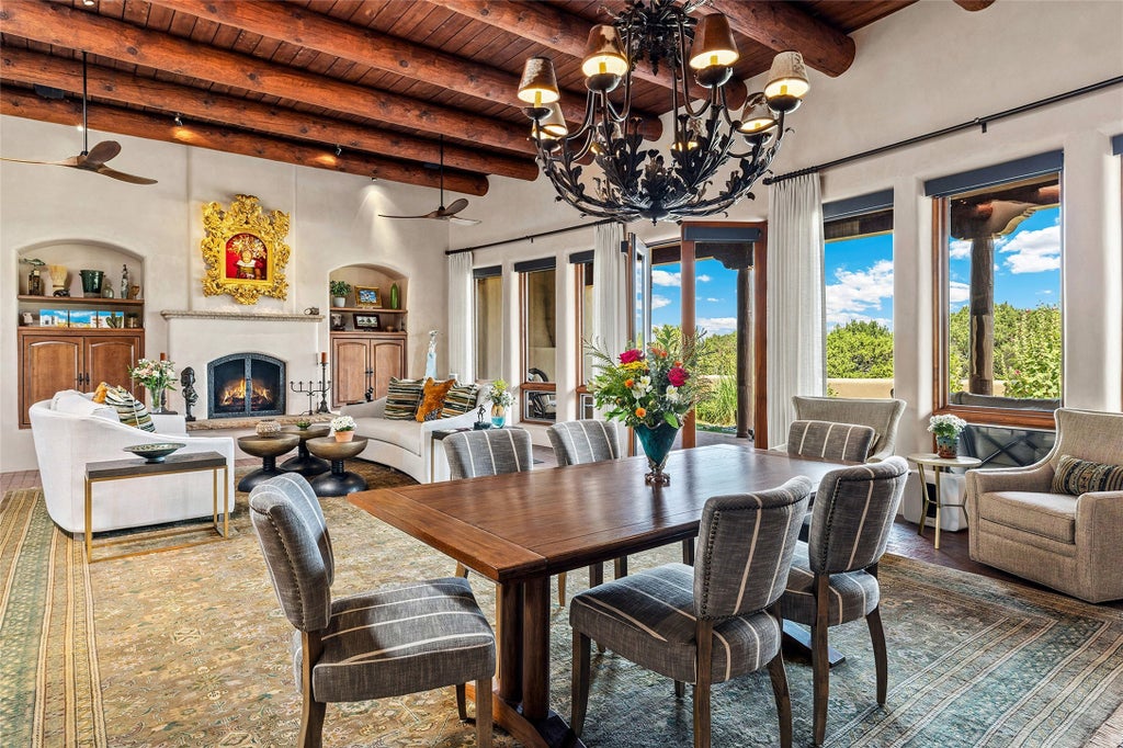 Experience the ultimate Santa Fe lifestyle in this stunning Las Campanas residence showcasing sweeping views of the Sangre de Cristo Mountains and newly updated luxury finishes throughout. Built by award-winning builder Tierra Concepts, this exceptionally designed single-level home features four bedrooms and embraces the essence of quintessential Santa Fe architecture, paired with a seamless indoor-outdoor lifestyle. Just minutes from both the historic Plaza and The Club at Las Campanas, this home welcomes you with a beautifully landscaped front courtyard adorned with vibrant landscape. The fully enclosed back portal, complete with a cozy fireplace and built-in BBQ, offers the perfect setting for year-round entertaining and a secure retreat for pets. The newly designed chef's kitchen, by the acclaimed designer David Naylor impresses with a natural stone island and breakfast bar, newly installed custom cabinetry, abundant storage and premium state-of-the-art appliances, all of which opens to a casual dining or living area, with its own fireplace and direct portal access. From there, the space flows effortlessly into the expansive great room, with a spacious formal dining area, fireplace and dramatic picture windows which frame the breathtaking Sangre de Cristo mountain views. The luxurious, private owner’s suite is a serene escape, boasting a kiva-style fireplace, mountain views and a tranquil spa-like modern bath complete with a stand-alone soaking tub, walk-in shower, dual vanities with natural stone counters and dual walk-in closets. Guests enjoy complete independence with a spacious ensuite which offers a full bath and large walk-in closet, plus two additional guest bedrooms which share a well-appointed full bath, offering privacy and flexibility. Additional updates include a newly updated roof and ductless cooling and heating system, plus an updated boiler for radiant heating. A full updated features list is available upon request. This home is not to be missed!
