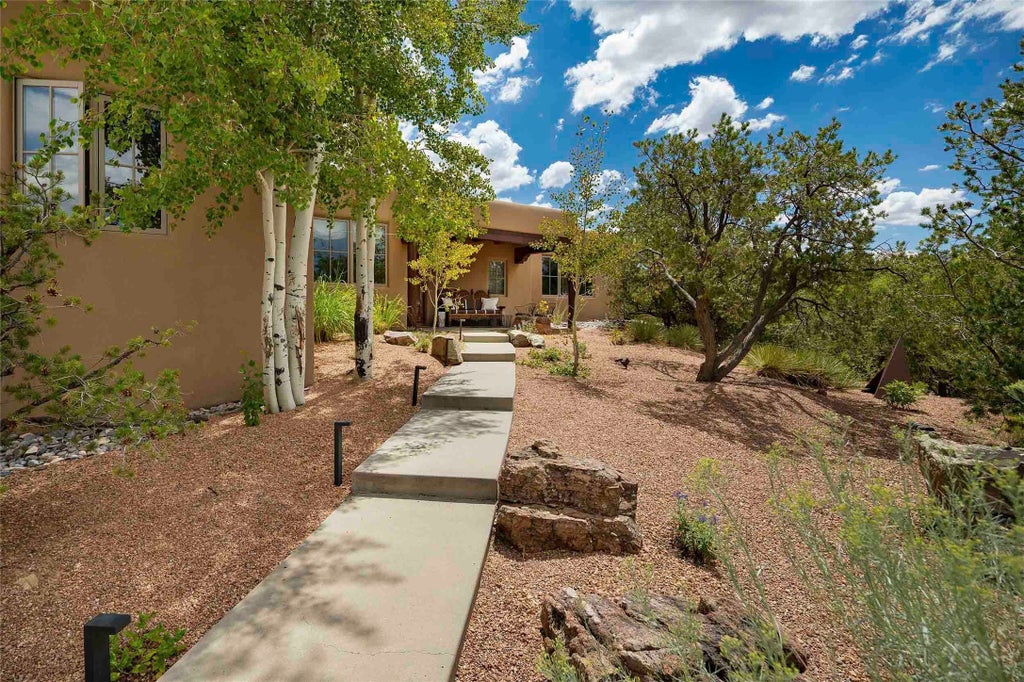 Rare Eastside Private and Gated La Cantera – Timeless Southwestern Elegance - Minutes from Canyon Road and the historic Plaza, this distinguished La Cantera home offers 3BR, 3BA and apx 2,715 sqft of refined living on nearly an acre - one of the enclave’s largest and most coveted, private parcels. A graceful drive unveils an luxurious residence with high viga ceilings, hand-troweled plaster walls, and the golden glow of kiva fireplaces. Expansive living and dining rooms flow with effortless sophistication, grounded by wide tile floors. Soft carpeted bedrooms balance comfort and ease, with radiant heat throughout. The gourmet kitchen pairs polished granite, rich alder cabinetry, and sleek stainless appliances, while a luminous banco breakfast nook bathes in morning sun. Two master suites provide generous proportions and a serene ambiance, joined by a versatile third bedroom or office. The residence is completely single-level once entered. Outdoors, inviting portals designed for dining and entertaining create natural circulation into the gardens. A variety of fruit trees including peach, plum, cherry, apple and apricot, and a meandering wooded meditation walking path with fountain complete this secluded haven. Secured within La Cantera’s gates with a 2-car attached garage, this rare property offers privacy, beauty, and architectural distinction - a world away but an easy stroll to Canyon Road’s world renowned galleries and fine dining including Geronimo, The Tea House, and El Farol.