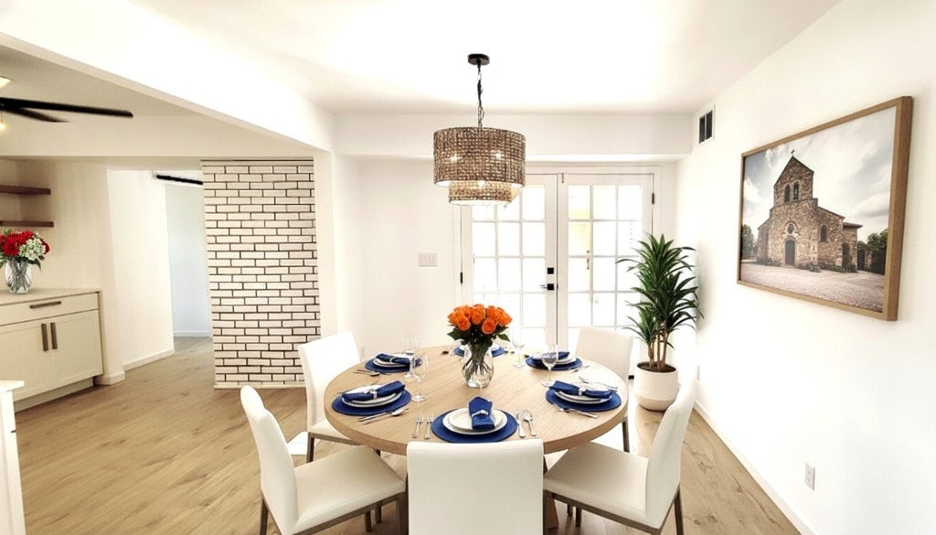 Welcome to this stunningly remodeled Colonial-style home nestled in the heart of Northern New Mexico! Beautifully remodeled with a Separate Studio on ¾ Acre begins your journey to your new home! Impress all your guests as you enter the updated modern kitchen with beautiful floating shelves and chef style appliances. Each bedroom features spacious layouts, designer ceiling fans, large picture windows and beautiful hardwood flooring! This property offers the perfect blend of classic charm and contemporary upgrades. Step inside to discover a stunning and beautifully updated interior with attention to detail throughout! Gleaming stainless steel finishes and lavishly designed fixtures compliment the light and natural wood flooring. This light-filled layout is ideal for both relaxation and entertaining. The open-concept kitchen flows seamlessly into the spacious dining room and main living areas, making it the heart of the home. This fabulous property showcases a large backyard offering plenty of space for gardening, gatherings, or even future additions. Whether you’re sipping coffee on the porch or hosting a barbecue under the New Mexico sky, this phenomonal home can be your own private oasis.