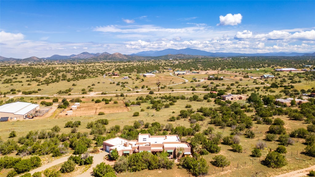 Peaceful Country Living with Room to Roam! If you’ve been searching for unencumbered horse property, extra elbow room, or simply a serene retreat away from the bustle, this exceptional home delivers. Nestled on 10 fenced acres at the end of a private lane, the elevated setting offers breathtaking eastern views of the Sangre de Cristo Mountains. Enjoy your mornings with sunlit vistas and your evenings under the shaded portal, where sunsets dance across the mountains. A welcoming enclosed courtyard and striking entryway lead inside, where sandstone floors contrast beautifully with vigas and wood-beamed ceilings. Smooth plaster walls add elegance, while thoughtful upgrades throughout the home reflect quality and care. The split three-bedroom floor plan is enhanced by a spacious bonus room with a closet, currently used as an office and game room. The updated kitchen features stainless steel appliances, a convection cooktop, and a cozy dining nook warmed by a kiva fireplace. The owner’s suite is a retreat of its own with mountain views, outdoor access, and a luxurious 400+/- square foot bath, boasting a claw-foot soaking tub, steam shower, dual vanities, and a private water closet with bidet. You will also love the spacious laundry room with plenty of storage and utility sink and access to the back yard. Practical amenities include a shared well on the property that supplies both domestic water and drip irrigation, with the option to connect to the community water system if desired. A brand-new TPO roof was installed in 2018. On the acreage, an alternate site with electric and water is ready for a barn, guest house, or studio—making this property as versatile as it is beautiful. Come experience the best of Northern New Mexico living—space, views, and a home filled with timeless Santa Fe character.