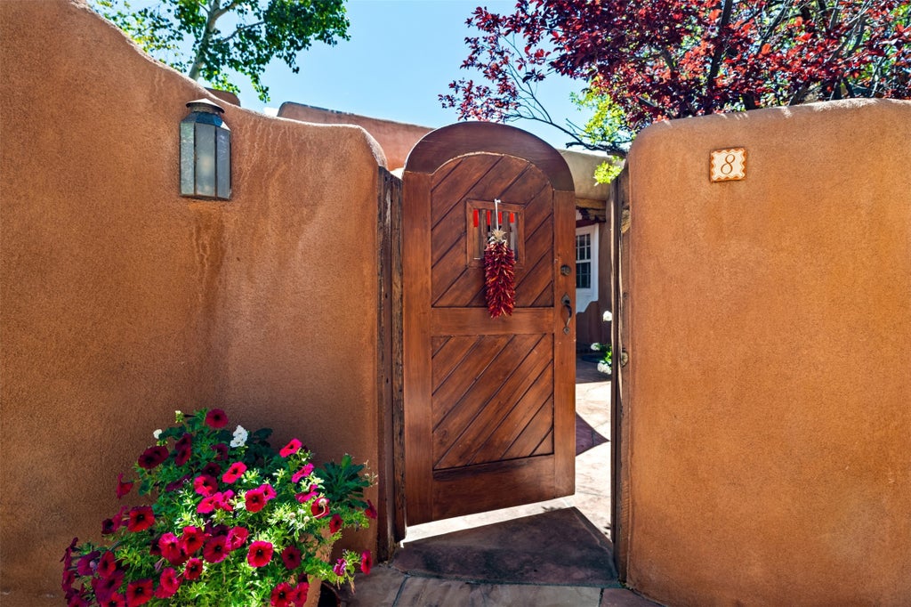 Charming condominium quarter ownership just a few blocks from the plaza. Beautiful architectural detail found in gracious old adobe home with vigas, kiva fireplaces, sculptural smooth plaster walls, hand adzed lintels above windows and doors. Tile kitchen and baths. All furnishings and maintenance, inside and out by COA. Front and back courtyards. Professionally managed and completely furnished downtown vacation condominium.