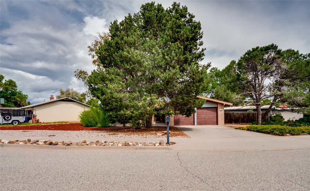 Tucked behind mature trees and shrubs for added privacy, this charming ranch-style home in White Rock offers comfort, functionality, and a serene setting. Step inside through the tiled front entrance hallway, where graceful arched doorways guide you into the spacious living room. Here, a wall of windows overlooks the front yard, filling the space with natural light, while a stove-insert fireplace creates a warm and inviting centerpiece. At the heart of the home is the cozy dining room with tile flooring and a convenient pass-through to the kitchen, making gatherings and meals easy to enjoy. The modern kitchen is beautifully updated with sleek wood cabinets accented by chrome hardware, black granite countertops, and stainless steel appliances, providing ample storage and workspace. Toward the back of the home, the bright family room becomes the perfect retreat, with expansive windows and French doors that open to the covered patio. There is a small space off the Family Room that's perfect for a small home office. There's two generously sized guest bedrooms and a full guest bath complete with a single sink vanity and a glass-enclosed tiled shower/tub. The large primary bedroom offers comfort and convenience with its en-suite bath, featuring a tiled walk-in shower and single sink vanity. A laundry room is located near the front of the home, as well as direct access to the two-car garage. Step outside to your private oasis. Thoughtfully landscaped with manicured flower beds, lush grass lawns, and mature shade trees, it provides both beauty and functionality. The covered patio is perfect for barbecues and outdoor dining, while the open lawn offers space for play or gardening. Situated in a peaceful neighborhood and close to local parks and scenic trails, this home combines privacy with modern convenience in a desirable location. Take a tour today and discover the warmth and charm this home has to offer!