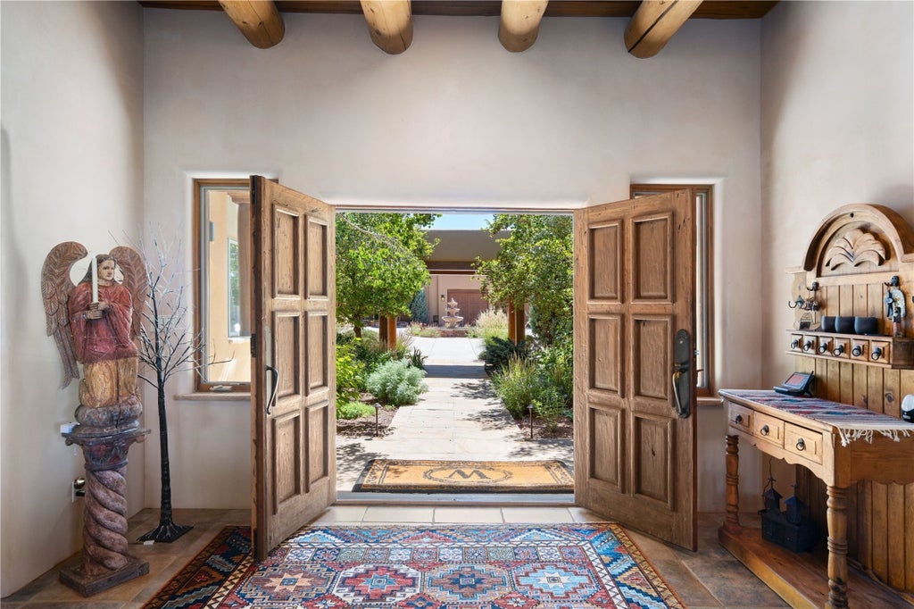 Set high on a private hilltop, and enjoying sunset mountain views, this custom Pueblo Revival compound embodies craftsmanship, substance, and timeless Santa Fe style. Built with quality at every turn and refreshed with a new roof and stucco, the property is introduced by a grand, gated courtyard with center fountain, full poured concrete drive, and a spacious garage for 4 cars. The 3-bedroom main residence, remodeled by Kim Dressel in 2012, reveals artisan details from the moment you step into the dramatic Zaguan entry. Finishes include slate floors, carved woodwork by master craftsman David Naylor, thick plaster walls, and a freestanding bar that anchors the open living and dining spaces. The chef’s island kitchen features Wolf, Sub-Zero, and wine refrigeration, ideal for both daily living and entertaining. The split-bedroom layout offers privacy, while the primary suite is a sanctuary with dual closets, built-ins with fridge, kiva fireplace, and a dedicated exercise room. Outdoor living extends to multiple portals, a rooftop deck with 360° mountain views, a full kitchen, fireplace, and an elegant in-ground cocktail pool. The 3,050 sq. ft. second residence, newly built by Kim Dressel in 2013, echoes the same solid construction and fine finishes. With 2 bedrooms, 2 living rooms, a full kitchen and dining space, carved details by David Naylor, and far-reaching Sangre de Cristo and Jemez views, it offers luxurious comfort. Special features include a built-in bar, 90-inch screen with 9-speaker theater, and an expansive portal with pizza oven, grill, and fireplace. Additional amenities—a workshop, generator, and 15,000 gallon irrigation cistern—enhance function and reliability. Only 15 minutes from The Plaza and Santa Fe Airport, this compound is ideal for multi-generational living or hosting guests in a one-of-a-kind setting where custom design, quality finishes, and Pueblo Revival authenticity define the experience. A contiguous 1.7-acre lot on Black Mesa may be available separately. Membership to the Club at Las Campanas is available for purchase and upon approval.