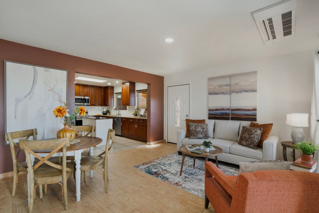 Step inside to a light-filled living room featuring elegant wood-look tile floors, inset lighting, and a seamless flow to the outdoors. A door leads to a large covered portal, running almost the entire length of the house, where carved wooden posts add a touch of timeless Southwestern character—perfect for relaxing or entertaining.